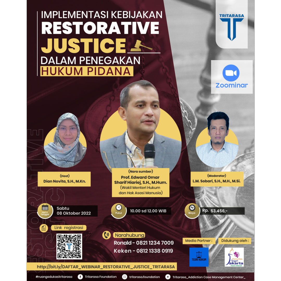 Webinar ini mengundang narasumber yang merupakan Wakil Menteri Hukum dan HAM RI, Prof. Edward Omar Sharif Hiariej, S.H., M.Hum. membahas restorative justice.